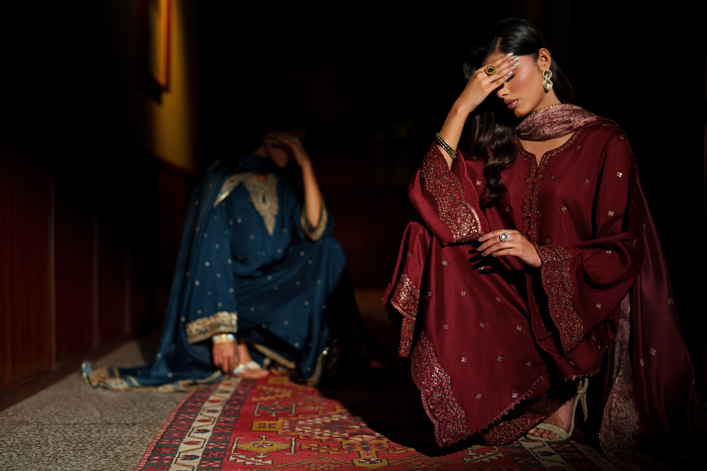 The 3-piece ensemble includes a beautifully embroidered shirt, a complementing plazo tailored for effortless elegance, and a coordinated dupatta that completes the festive look. Designed to transition seamlessly from intimate gatherings to formal celebrations, Aurelia is a statement of refined taste and elevated style.